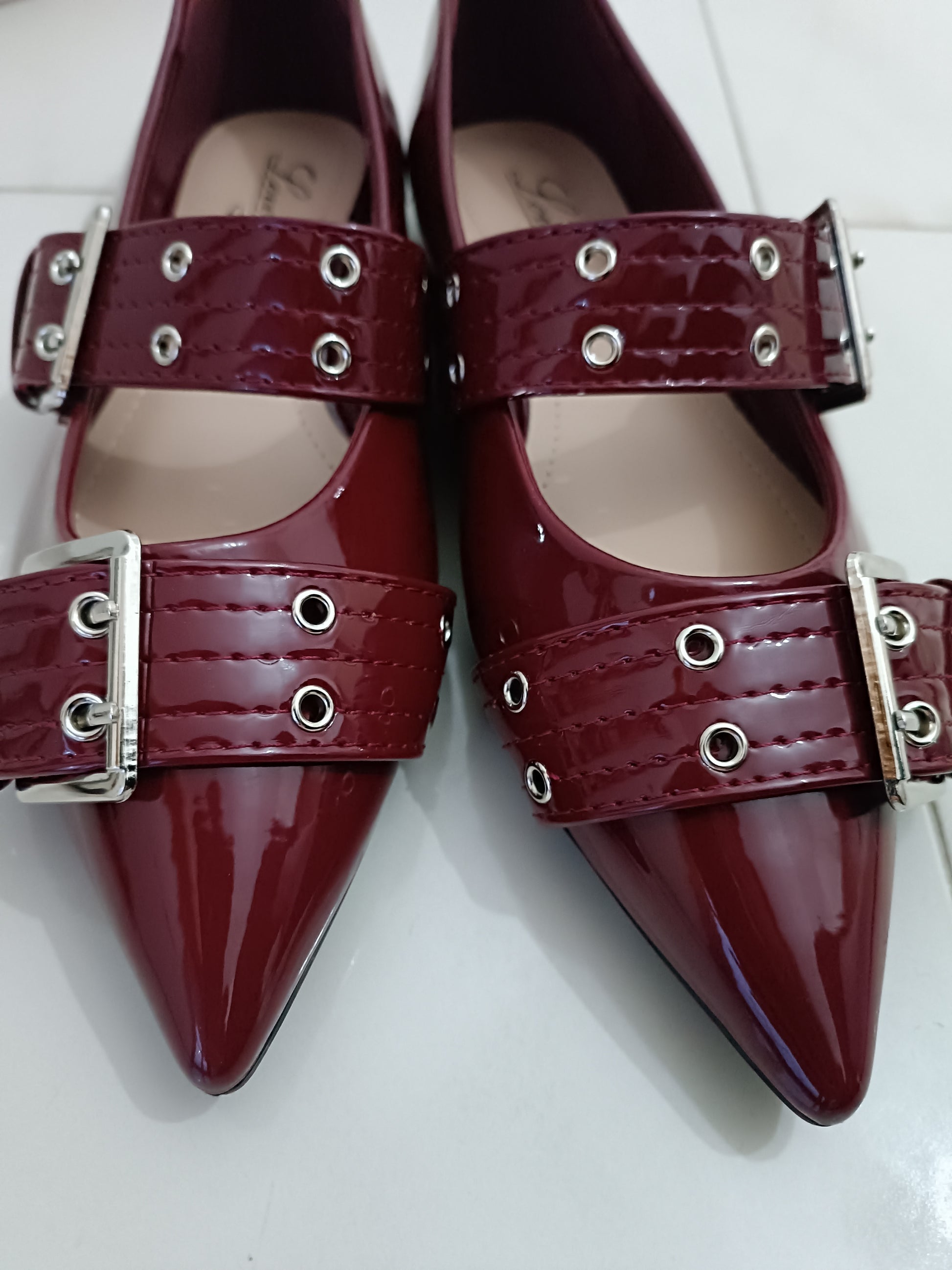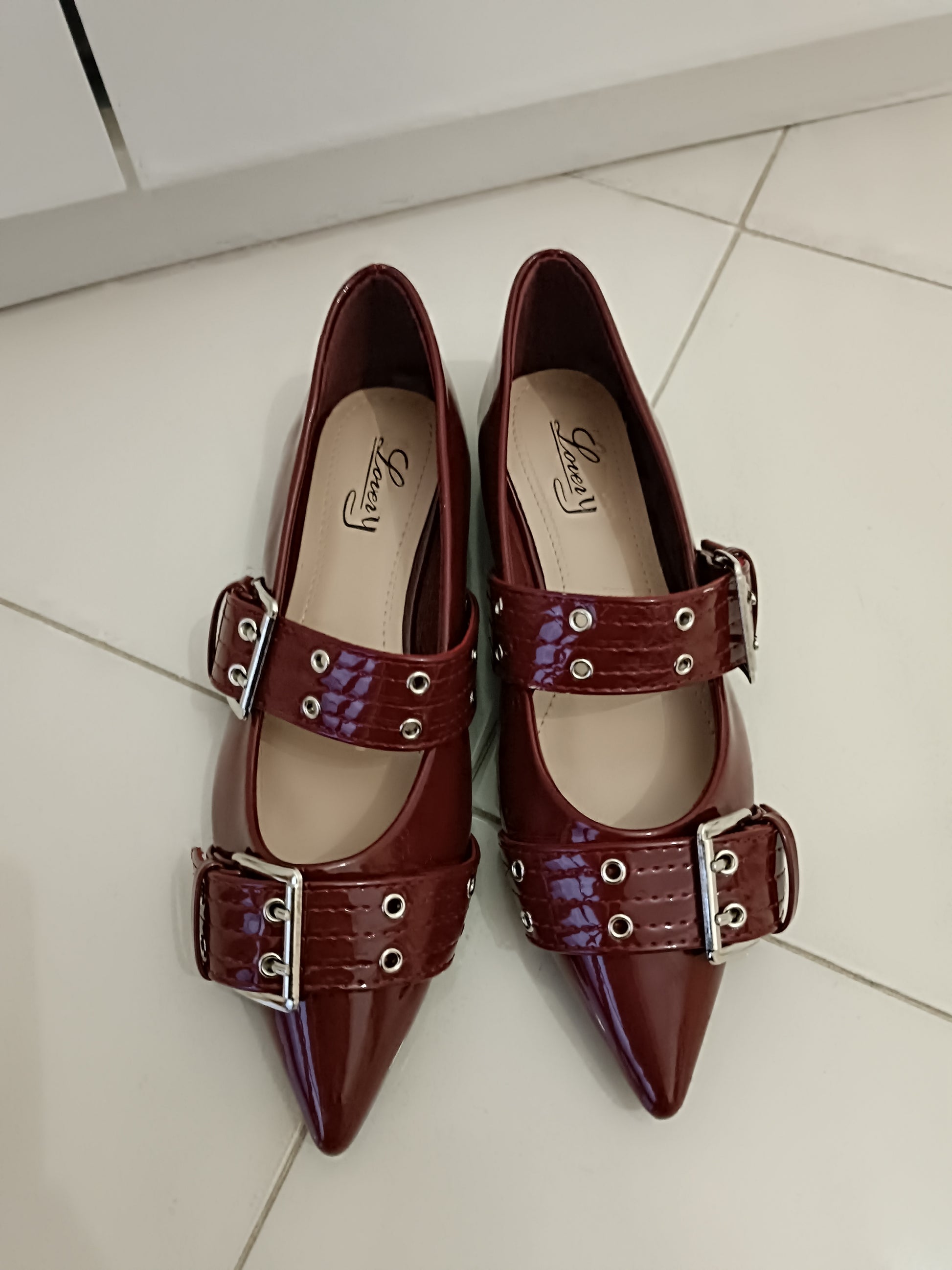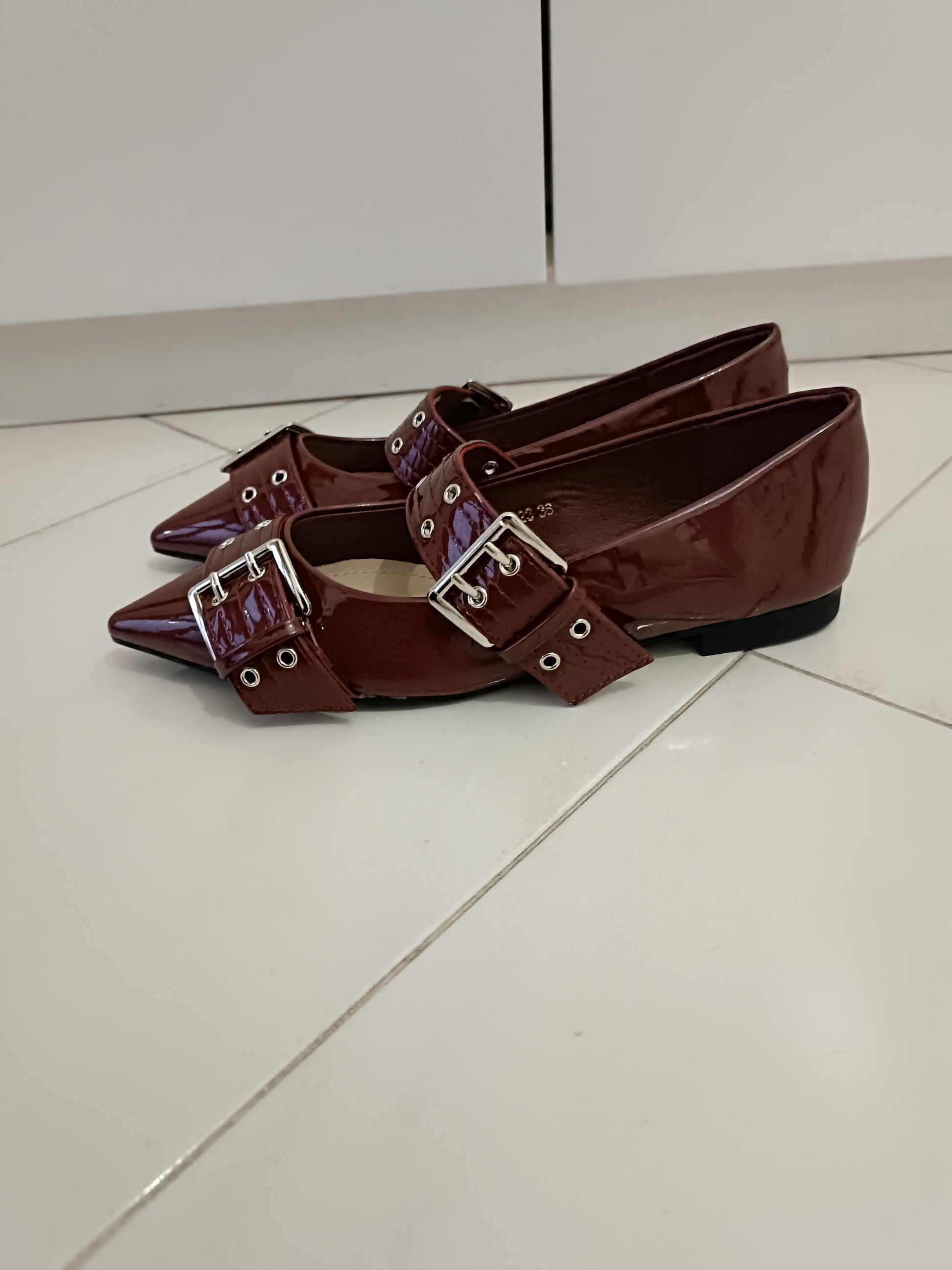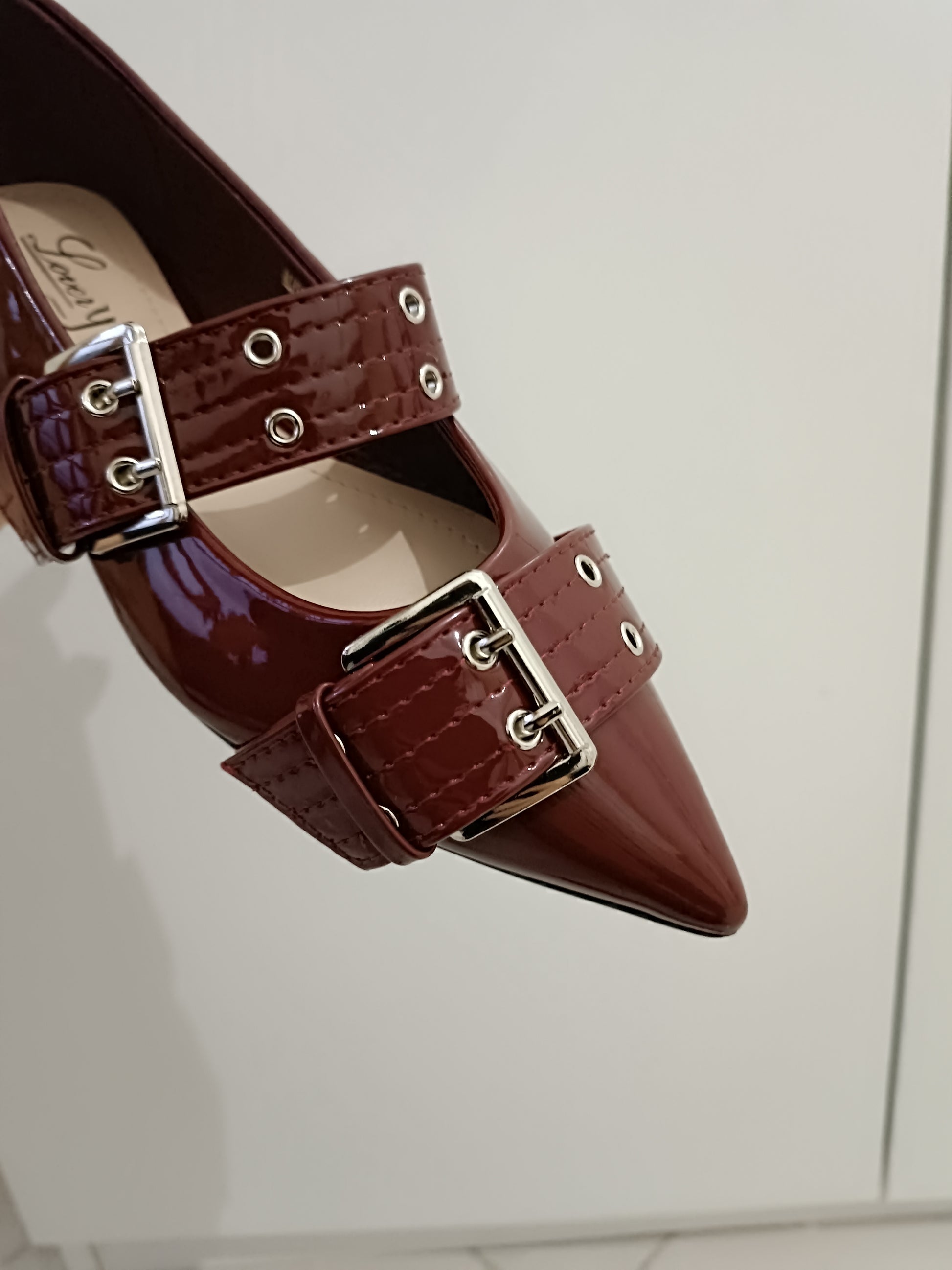 Ballerina a punta in vernice lucida bordeaux con fibbia e cinturino